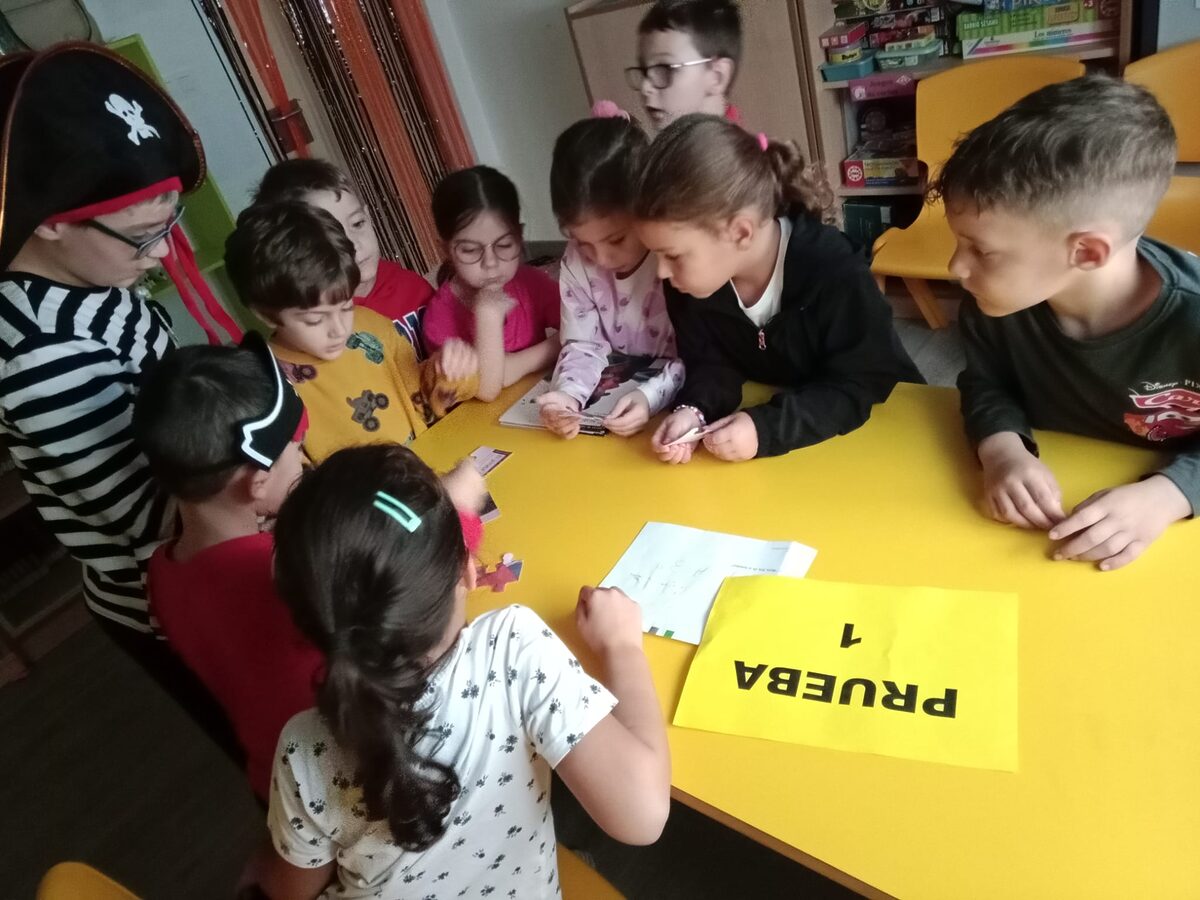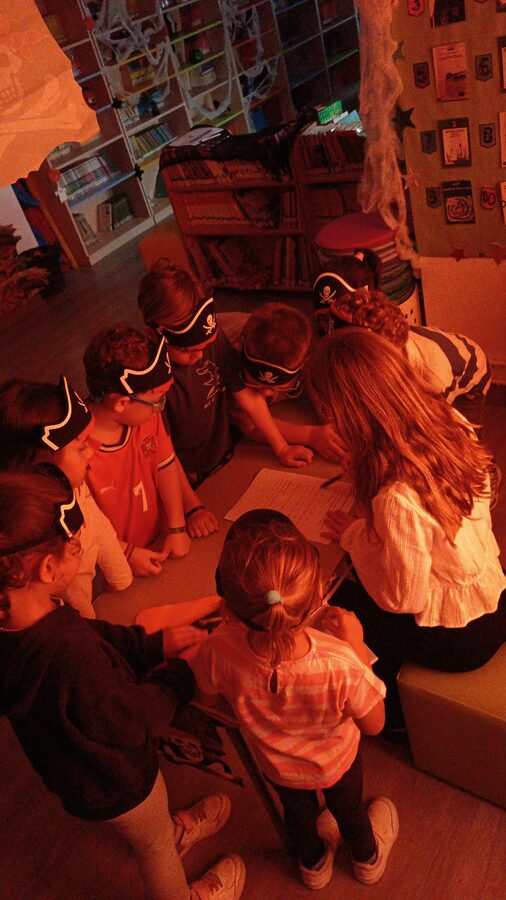 La actividad estrella fue, sin duda, nuestro Escape Room pirata, donde los mismísimos personajes de Piratas del Caribe dieron la bienvenida a una nueva tripulación en la legendaria Perla Negra. La biblioteca del colegio se convirtió en un espacio lleno de misterio y aventuras, donde los participantes resolvían enigmas, se enfrentaban a desafíos de ingenio y descubrían libros de piratas tan divertidos como El Pirata Metepata o El Pirata Garrapata